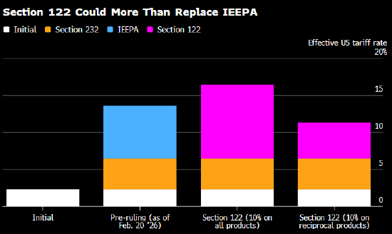 特朗普暗示,除了将根据《1974 年商业法》122 条目开征的、无效期 150 天的根本关税外,他还将根据统一项法案的 301 条目,以及 1962 年出台的 232 条目启动额外查询拜访。232 条目付与总统认为名征收关税的,特朗普此前也曾征引该条目对进口汽车和钢铁征收关税。