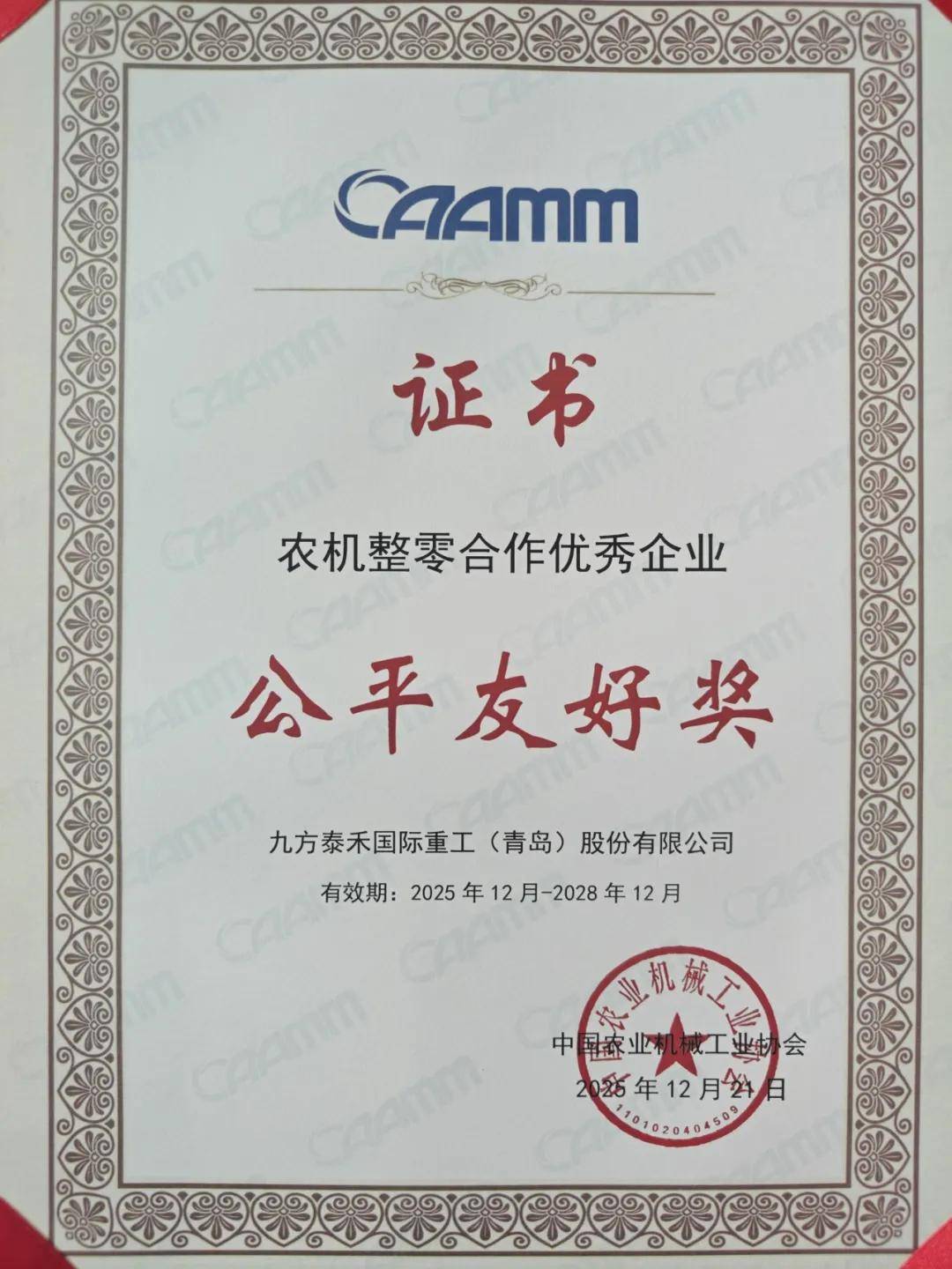 近日,九方泰禾国际沉工(青岛)股份无限公司再添行业荣誉!正在中国农业机械工业协会组织的农机整零合做优良企业评选中,公司凭仗杰出的合做立异能力取行业口碑,一举拿下 “联袂立异”和“公允敌对”两项大,这是行业对公司正在农机整零合做范畴凸起贡献的高度承认!